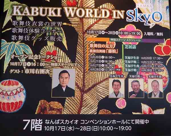 また、同じく17日(水)から、「なんばスカイオ」7階のコンベンションホールにおいて、歌舞伎衣裳展「KABUKI WORLD IN SKYO(スカイオ)」も始まり、豪華な歌舞伎衣裳の数々を間近でご覧いただくことができます。会場内の歌舞伎体験コーナーでは、歌舞伎の小道具に実際に触れることもできますので、あわせてぜひ、お立ち寄りください。会期は10月28日(日)までです。